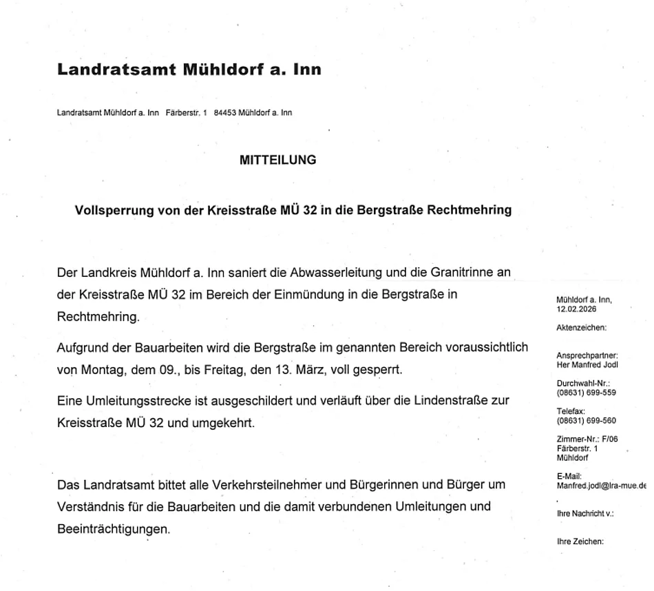 Vollsperrung von der Kreisstraße MÜ 32 in die Bergstraße Rechtmehring OT Freimehring