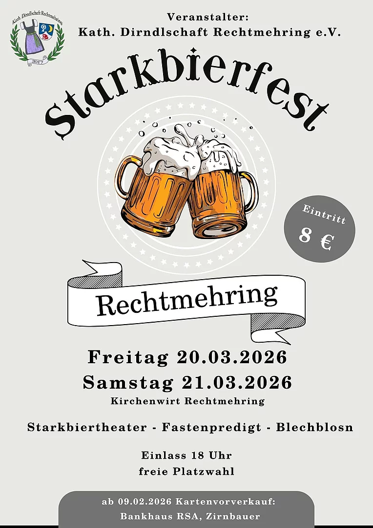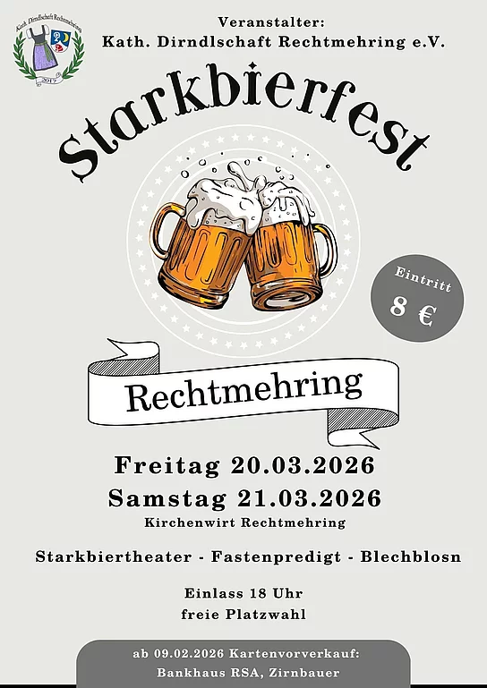 Die Dirndlschaft Rechtmehring lädt herzlich zum Starkbierfest am Freitag, den 20.03.2026 und am Samstag, den 20.03.2026 beim Kirchenwirt in Rechtmehring ein.